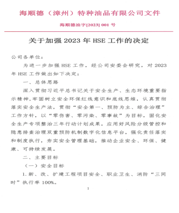 海順德(漳州)特種油品有限公司為進(jìn)一步落實(shí)企業(yè)安全生產(chǎn)主體責(zé)任,強(qiáng)化公司安全、環(huán)保、健康管理工作,開(kāi)年之初便下發(fā)了公司一號(hào)文——《關(guān)于加強(qiáng)2023年HSE工作的決定》。明確公司2023年度安全目標(biāo)和環(huán)保目標(biāo)。目標(biāo)明確要求安全方面要實(shí)現(xiàn)公司全年報(bào)車間(部門)級(jí)以上事故為零,不發(fā)生被政府部門處罰的重大隱患和事件,企業(yè)主要負(fù)責(zé)人、安全管理人員安全能力考核合格率100%,特殊工種從業(yè)人員持證上崗率100%,八大特殊作業(yè)JSA分析率100%,承包商、危險(xiǎn)化學(xué)品車輛安全相關(guān)資質(zhì)合格率100%等重要目標(biāo)。環(huán)保方面要求做到不發(fā)生被政府部門處罰的環(huán)境問(wèn)題和污染事件,排污許可執(zhí)行率100%,污水外送合格率100%,環(huán)境監(jiān)測(cè)計(jì)劃執(zhí)行率100%等具體指標(biāo)。